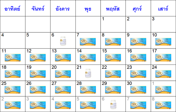 วันที่ 1 รับประทานยาแก้ไข้ (ยาล้างพิษภายใน) ก่อนอาหารเช้าและเย็น ครั้งละ 2 แคปซูล (ไม่ต้องรับประทานยาประดง) วันที่ 2 - 15 รับประทานยาประดง ก่อนอาหารเช้า-กลางวัน-เย็น • ถ้าน้ำหนักตัวน้อยกว่า 50 กิโลกรัม ให้รับประทานยาประดงครั้งละ 1 แคปซูล • ถ้าน้ำหนักตัวมากกว่า 50 กิโลกรัม ให้รับประทานยาประดงครั้งละ 2 แคปซูล (ไม่ต้องรับประทานยาแก้ไข้) วันที่ 16 รับประทานยาแก้ไข้ (ยาล้างพิษภายใน) ก่อนอาหารเช้าและเย็น ครั้งละ 2 แคปซูล (ไม่ต้องรับประทานยาประดง) วันที่ 17 - 30 รับประทานยาประดง ก่อนอาหารเช้า-กลางวัน-เย็น • ถ้าน้ำหนักตัวน้อยกว่า 50 กิโลกรัม ให้รับประทานยาประดงครั้งละ 1 แคปซูล • ถ้าน้ำหนักตัวมากกว่า 50 กิโลกรัม ให้รับประทานยาประดงครั้งละ 2 แคปซูล (ไม่ต้องรับประทานยาแก้ไข้) ในรอบเดือนต่อๆไปให้รับประทานยาเช่นเดียวกัน เพื่อให้ง่ายต่อการจำ ขอแนะนำให้ทานยาแก้ไข้ในวันออกหวย คือวันที่ 1 และวันที่ 16 ของทุกเดือน ![]() ตัวอย่างที่ 1 - การรับประทานยาประดง ![]() ตัวอย่างที่ 2 - การรับประทานยาประดง การเดินทางมาห้างขายยาตราเรด้า